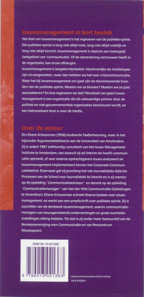 'Issuesmanagement' is langetermijnbeleid. Veenbrandjes als mediahypes zijn zo aangestoken, maar dan hebben we het over crisiscommunicatie. Waar het bij issuesmanagement om gaat zijn de doorsmeulden branden van de publieke opinie. Moeten we ze blussen? Moeten we ze juist aanwakkeren? En hoe regisseren we dat? Resultaat van goed issuesmanagement is een organisatie die als volwaardige partner door de politiek en niet-gouvermentele organisaties beschouwd wordt, en een betrouwbare bron is voor de media.