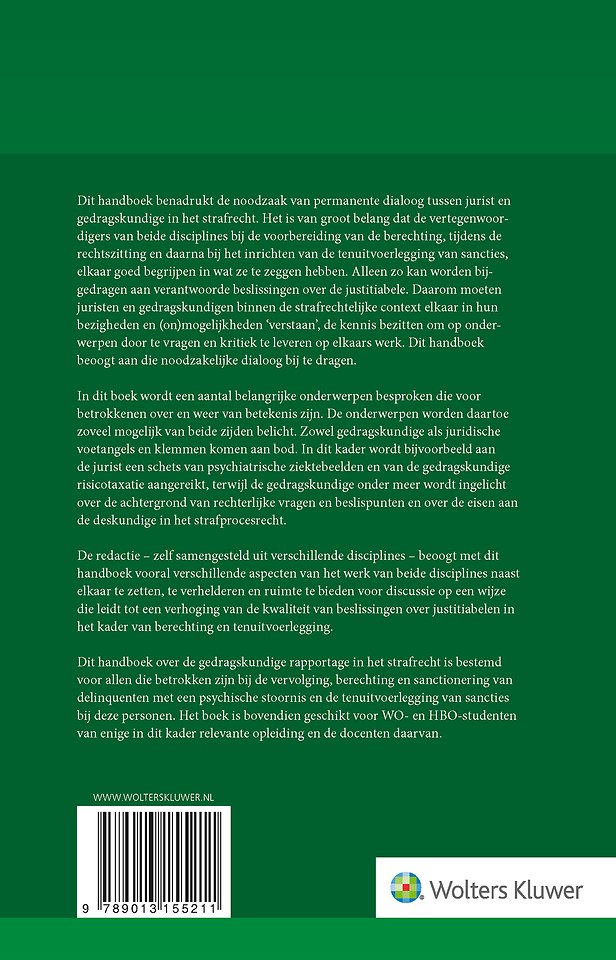 Dit handboek benadrukt de noodzaak van de permanente dialoog tussen jurist en gedragskundige in het strafrecht. Het is van groot belang dat de vertegenwoordigers van beide disciplines elkaar goed begrijpen en ‘verstaan’. Zowel bij de voorbereiding van de berechting als tijdens de rechtszitting en daarna bij het inrichten van de tenuitvoerlegging van sancties. Alleen op die manier kan worden bijgedragen aan verantwoorde beslissingen over de justitiabele.