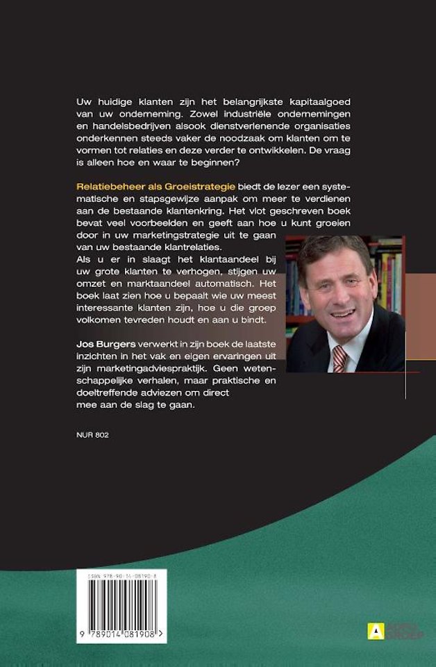 'Relatiebeheer als groeistrategie' biedt de lezer een systematische en stapsgewijze aanpak om meer te verdienen aan de bestaande klantenkring. Het vlot geschreven boek bevat veel voorbeelden en geeft aan hoe u kunt groeien door in uw marketingstrategie uit te gaan van uw bestaande klantrelaties. Als u er in slaagt het klantaandeel bij uw grote klanten te verhogen, stijgen uw omzet en marktaandeel automatisch. Het boek laat zien hoe u bepaalt wie uw meest interessante klanten zijn, hoe u die groep volkomen tevreden houdt en aan u bindt.