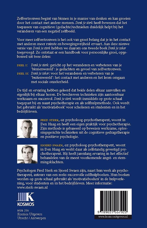 Denk je sterk helpt via cognitieve (gedachte)technieken bij het verbeteren van een negatief zelfbeeld en het bijbehorende Denk je zeker helpt je buitenwereld te veranderen en het contact met anderen te verbeteren. Het doel is om zelfvertrouwen te krijgen en sociale onzekerheid te verminderen.