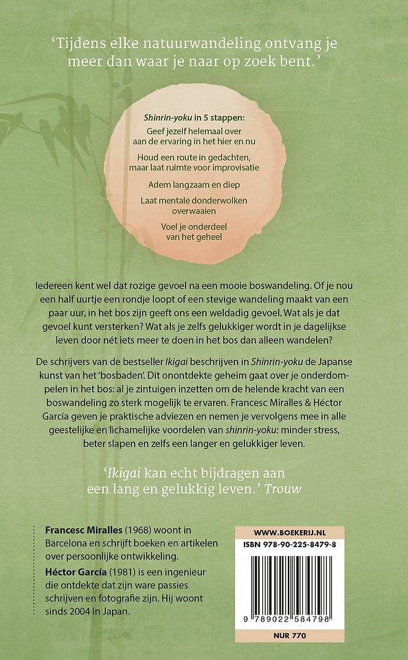 De schrijvers van de bestseller Ikigai beschrijven in Shinrin-yoku de Japanse kunst van het ‘bosbaden’. Dit onontdekte geheim gaat over je onderdompelen in het bos: al je zintuigen inzetten om de helende kracht van een boswandeling zo sterk mogelijk te ervaren. Francesc Miralles & Héctor García geven je praktische adviezen en nemen je vervolgens mee in alle geestelijke en lichamelijke voordelen van Shinrin-yoku: minder stress, beter slapen en zelfs een langer en gelukkiger leven.