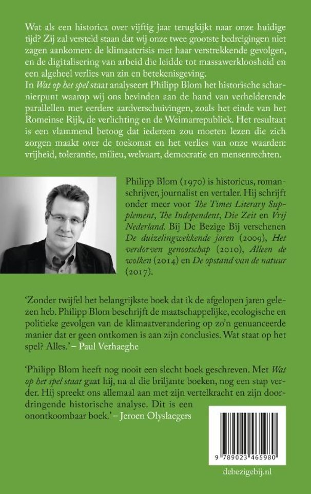 In 'Wat op het spel staat' analyseert Philipp Blom het historische scharnierpunt waarop wij ons bevinden aan de hand van verhelderende parallellen met andere historische aardverschuivingen, zoals het einde van het Romeinse Rijk, de Verlichting en de Duitse Weimarrepubliek. Het resultaat is een vlammend betoog vol sterke beelden en scherp verwoorde inzichten, dat iedereen zou moeten lezen die zich zorgen maakt over de toekomst van wat wij voor waardevol houden: vrijheid, tolerantie, het klimaat, arbeid, democratie en mensenrechten.