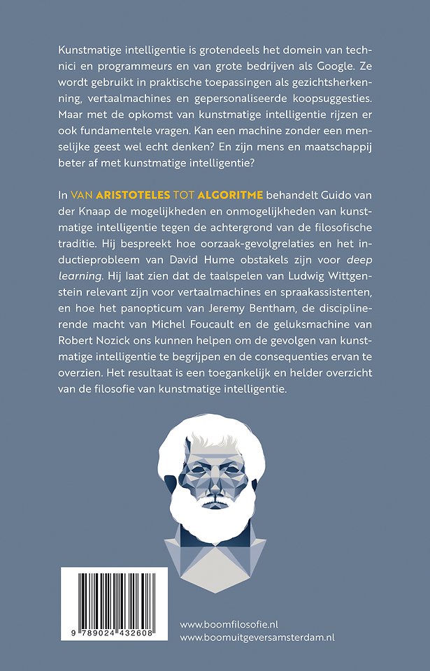 In Van Aristoteles tot algoritme behandelt Guido van der Knaap de mogelijkheden en onmogelijkheden van kunstmatige intelligentie tegen de achtergrond van de filosofische traditie. Hij bespreekt hoe oorzaak-gevolgrelaties en het inductieprobleem van David Hume obstakels zijn voor deep learning. Hij laat zien dat de taalspelen van Ludwig Wittgenstein relevant zijn voor vertaalmachines en spraakassistenten, en hoe het panopticum van Jeremy Bentham, de disciplinerende macht van Michel Foucault en de geluksmachine van Robert Nozick ons kunnen helpen om de gevolgen van kunstmatige intelligentie te begrijpen en de consequenties ervan te overzien. Het resultaat is een toegankelijk en helder overzicht van de filosofie van kunstmatige intelligentie.