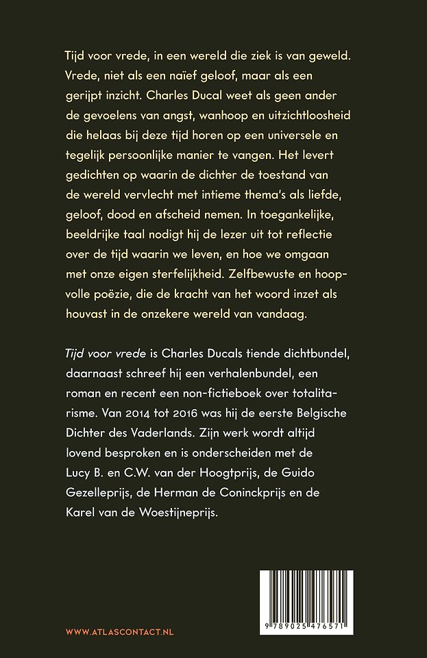 De wereld staat in brand. Dat klinkt duidelijk door in deze geëngageerde bundel, waarin de toestand van de wereld verweven wordt met de intieme thema's van liefde, geloof, dood en afscheid nemen. Tijd voor vrede. In een wereld die ziek is van geweld. Vrede, niet als een naïef geloof, maar als een gerijpt inzicht. Het bijzondere is dat Ducal de gevoelens van angst, wanhoop en uitzichtloosheid die helaas bij deze tijd horen op zo'n universele en tegelijk persoonlijke manier weet te vangen. In toegankelijke, beeldrijke taal nodigt deze bundel uit tot reflectie over de tijd waarin we leven, en hoe we omgaan met onze sterfelijkheid. Zelfbewuste en uiteindelijk hoopvolle poëzie ook, die de kracht van het woord inzet als houvast in de onzekere wereld van vandaag.