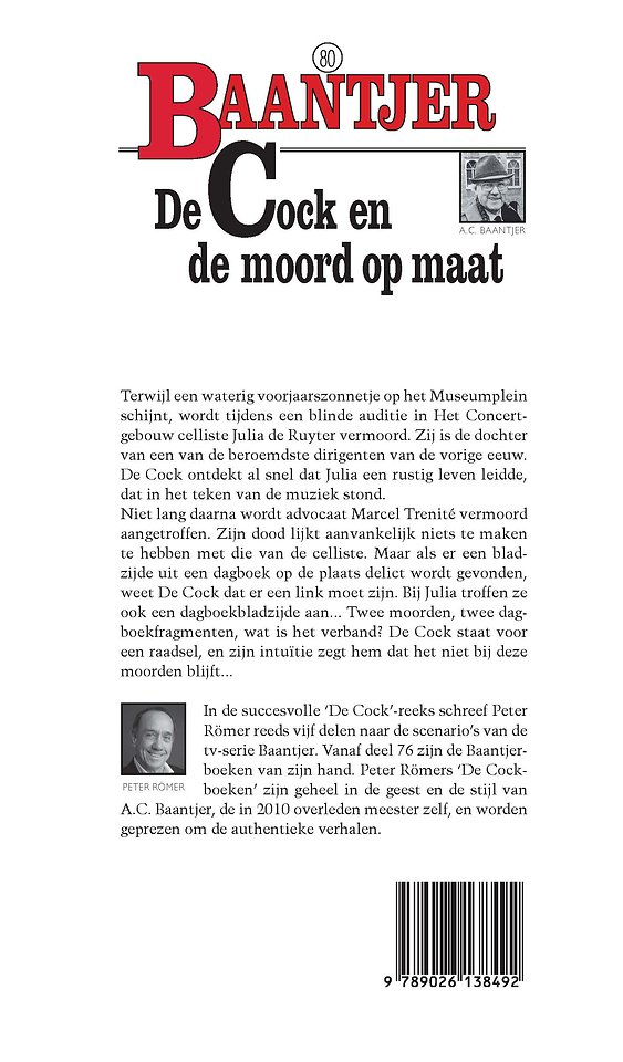 A.C. Baantjer is onsterfelijk geworden met zijn ‘De Cock’-reeks. Peter Römer is auteur en acteur. Nadat de ‘De Cock’-reeks werd voortgezet met vijf door hem geschreven delen naar de scenario’s van de tv-serie Baantjer, vervolgt hij nu de reeks met nieuw geschreven boeken. Peter Römer schrijft geheel in de geest van Appie Baantjer, en zijn ‘De Cock’jes’ worden geprezen om de authentieke verhaallijnen en dialogen.