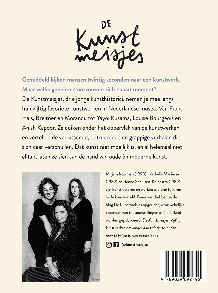 Gemiddeld kijken mensen twintig seconden naar een kunstwerk. Maar welke geheimen ontvouwen zich na dat moment? De Kunstmeisjes, drie jonge kunsthistorici, nemen je mee langs hun vijftig favoriete kunstwerken in Nederlandse musea. Van Frans Hals, Breitner en Morandi tot Yayoi Kusama, Louise Bourgeois en Anish Kapoor.
