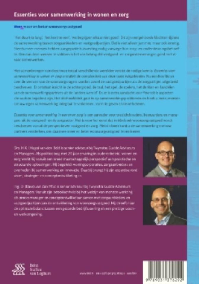 Het samenbrengen van deze twee totaal verschillende werelden vereist de nodige kennis. 'Essenties voor samenwerking in wonen en zorg' ontrafelt de complexiteit van deze twee vakgebieden. Na een hoofdstuk over de wensen van de woonzorgvragers worden zowel de vastgoedpartijen als de zorgpartijen uitgebreid beschreven. Er ontstaat inzicht in de achtergrond, de taal, het spel, de spelers, het denken en handelen van de samenwerkingspartners uit de 'andere wereld'. En er is extra aandacht voor financiële aspecten die vaak zo bepalend zijn. Het slothoofdstuk gaat in op samenwerkingsproblemen en biedt u instrumenten om uw eigen samenwerking integraal te verkennen, vorm te geven en te verbeteren.