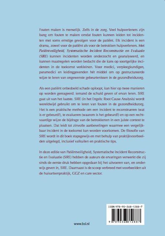 De auteurs hebben in Patiëntveiligheid, Systematische Incident Reconstructie en Evaluatie (SIRE) de ervaringen verwerkt die zij hebben opgedaan bij het uitvoeren van, en onderwijs geven in, SIRE. Daarnaast is de scoop verbreed met voorbeelden uit de huisartsenpraktijk, GGZ en care sector.