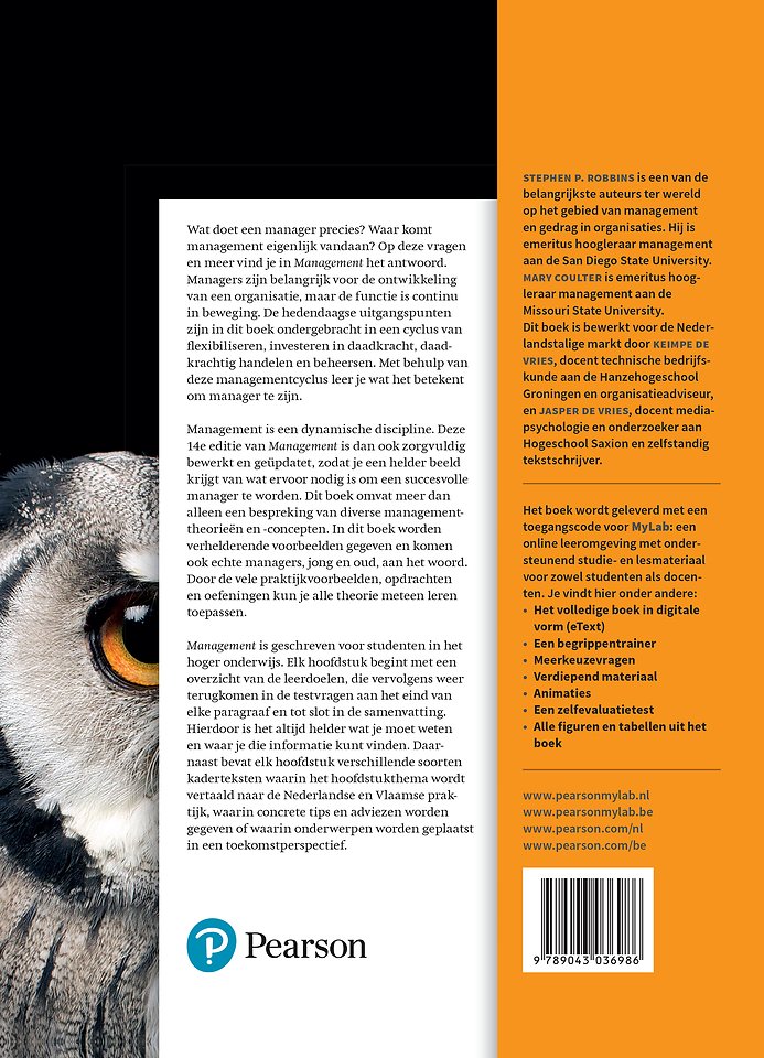 Management is een dynamische discipline. Deze 14e editie van Management is dan ook zorgvuldig bewerkt en geüpdatet, zodat je een helder beeld krijgt van wat ervoor nodig is om een succesvolle manager te worden. Dit boek omvat meer dan alleen een bespreking van diverse managementtheorieën en -concepten. In dit boek worden verhelderende voorbeelden gegeven en komen ook echte managers, jong en oud, aan het woord. Door de vele praktijkvoorbeelden, opdrachten en oefeningen kun je alle theorie meteen leren toepassen.