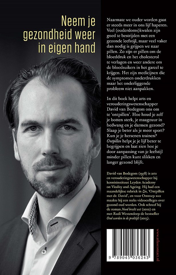 Van Bodegom helpt ons om te ontpillen. Hoe houd je zelf je botten sterk, je maagzuur in bedwang en je darmen gezond? Slaap je beter als je meer sport? Kun je je hersenen trainen? ‘Ontpillen’ helpt je je lijf beter te begrijpen en laat zien hoe je door aanpassing van je leefstijl minder pillen kunt slikken en langer gezond blijft.