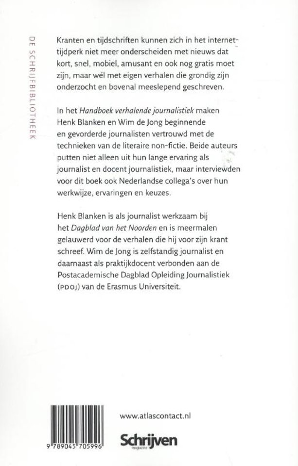 In het 'Handboek verhalende journalistiek' maken Henk Blanken en Wim de Jong beginnende en gevorderde journalisten vertrouwd met de technieken van de literaire non-fictie. Beide auteurs putten niet alleen uit hun lange ervaring als journalist en docent journalistiek, maar interviewden voor dit boek ook Nederlandse collega's over hun werkwijze, ervaringen en keuzes.