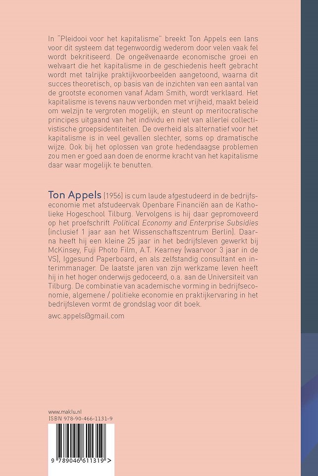 In “Pleidooi voor het kapitalisme” breekt Ton Appels een lans voor dit systeem dat tegenwoordig wederom door velen vaak fel wordt bekritiseerd. De ongeëvenaarde economische groei en welvaart die het kapitalisme in de geschiedenis heeft gebracht wordt met talrijke praktijkvoorbeelden aangetoond, waarna dit succes theoretisch, op basis van de inzichten van een aantal van de grootste economen vanaf Adam Smith, wordt verklaard. Het kapitalisme is tevens nauw verbonden met vrijheid, maakt beleid om welzijn te vergroten mogelijk, en steunt op meritocratische principes uitgaand van het individu en niet van allerlei collectivistische groepsidentiteiten. De overheid als alternatief voor het kapitalisme is in veel gevallen slechter, soms op dramatische wijze. Ook bij het oplossen van grote hedendaagse problemen zou men er goed aan doen de enorme kracht van het kapitalisme daar waar mogelijk te benutten.