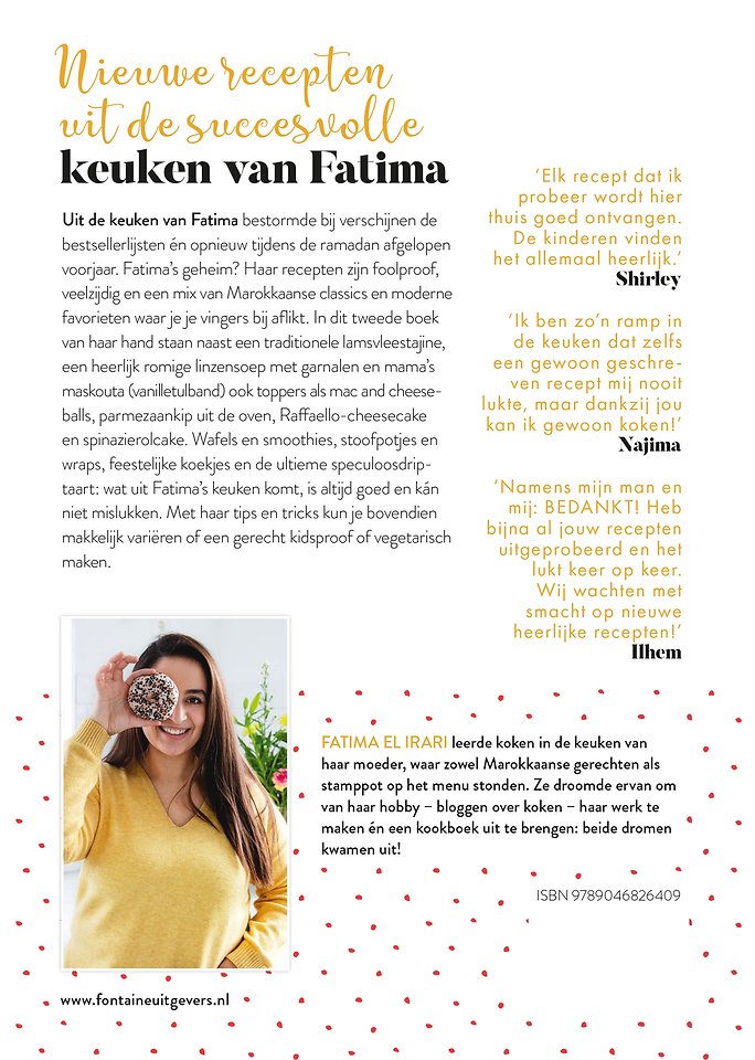 Op haar razend populaire blog laat Fatima El Irari dagelijks zien dat iedereen kan koken. Haar recepten zijn foolproof, veelzijdig en een mix van Marokkaanse classics en moderne favorieten waar je je vingers bij aflikt. In haar tweede boek, Uit de keuken van Fatima - elke dag anders, staan naast een traditionele lamsvleestajine, een heerlijk romige linzensoep met garnalen en mama's maskouta (vanilletulband) ook toppers als mac and cheeseballs, parmezaankip uit de oven en Raffaello-cheesecake. Wafels en smoothies, stoofpotjes en wraps, feestelijke koekjes en de ultieme chocolade drip taart: wat uit Fatima's keuken komt, is altijd goed en kán niet mislukken. Met haar tips en tricks kun je bovendien makkelijk variëren of een gerecht kidsproof of vegetarisch maken.