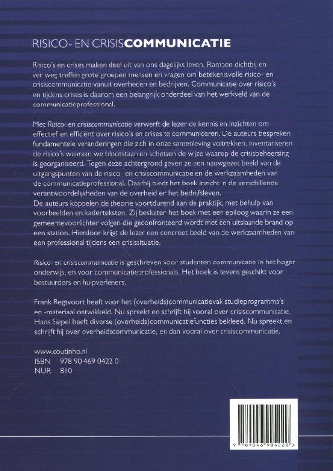 Tegen deze achtergrond geven ze een nauwgezet beeld van de uitgangspunten van de risico- en crisiscommunicatie en de werkzaamheden van de communicatieprofessional. Daarbij biedt het boek inzicht in de verschillende verantwoordelijkheden van de overheid en het bedrijfsleven.
