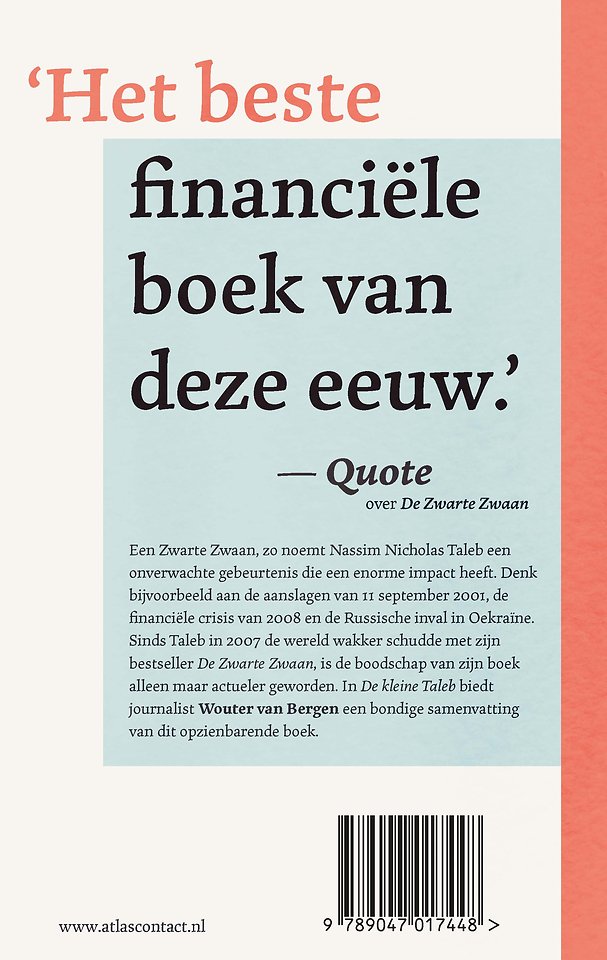 Sinds Taleb in 2007 de wereld wakker schudde met zijn bestseller 'De zwarte zwaan', is de boodschap van zijn boek alleen maar actueler geworden. 'De kleine Taleb' biedt een bondige samenvatting van het opzienbarende boek en bespreekt ook kort de andere titels uit Talebs ‘Incerto-serie’ over onvoorspelbaarheid.