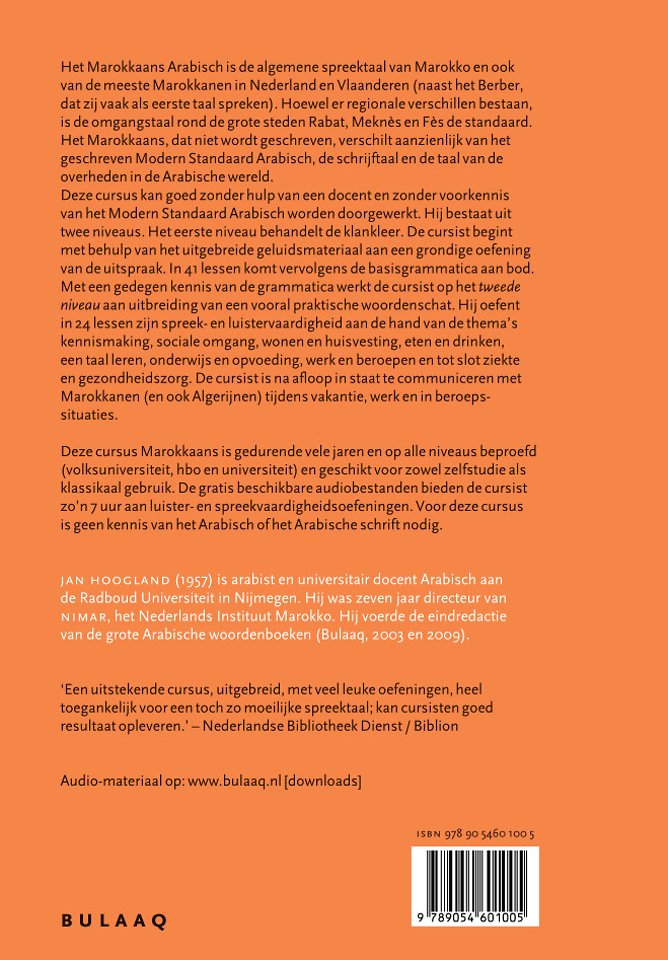Deze cursus Marokkaans is gedurende vele jaren en op alle niveaus beproefd (volksuniversiteit, hbo en universiteit) en geschikt voor zowel zelfstudie als klassikaal gebruik. De gratis beschikbare audiobestanden bieden de cursist zo'n 7 uur aan luister- en spreekvaardigheidsoefeningen. Voor deze cursus is geen kennis van het Arabisch of het Arabische schrift nodig.