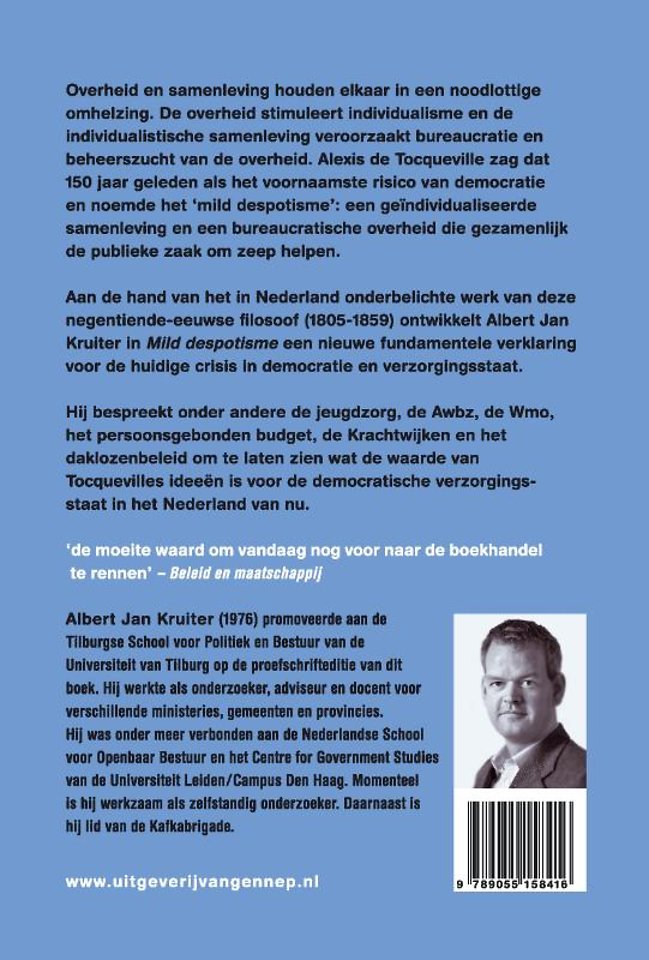 Aan de hand van het in Nederland onderbelichte werk van deze negentiende-eeuwse filosoof (1805-1859) ontwikkelt Albert Jan Kruiter in 'Mild despotisme' een nieuwe fundamentele verklaring voor de huidige crisis in democratie en verzorgingsstaat. Hij bespreekt onder andere de jeugdzorg, de Awbz, de Wmo, het persoonsgebonden budget, de Krachtwijken en het daklozenbeleid om te laten zien wat de waarde van Tocquevilles ideeën is voor de democratische verzorgingsstaat in het Nederland van nu.