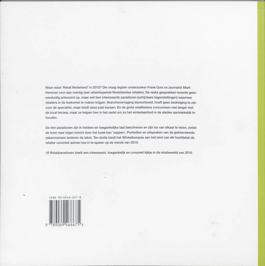Waar staat 'Retail Nederland' in 2010? Die vraag legden onderzoeker Frank Quix en journalist Mark Hemmer voor aan veertig zeer uiteenlopende Nederlandse retailers. De reeks gesprekken leverde geen eenduidig antwoord op, maar wel tien interessante paradoxen waarmee retailers in de toekomst zeker te maken krijgen. Brancevervaging bijvoorbeeld, hoeft geen bedreiging te zijn voor de specialist, maar biedt deze juist kansen. En de grote retailketens concurreren niet langer met de local heroes, maar ze helpen hen in het zadel om zo het winkelaanbod in de steden aantrekkelijk te houden.