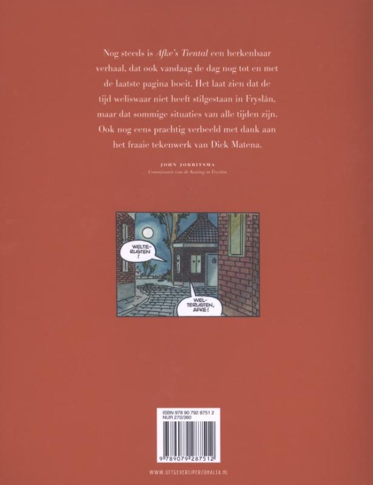 "Hoe het leven er ruim honderd jaar geleden in Fryslân uitzag, kunnen we ons dankzij Nienke van Hichtum goed voorstellen. Ze schreef met Afke's Tiental een prachtig boek over het zware bestaan van een arm arbeidersgezin uit Wergea. Dit boek is een reallife soap, want de familie met de tien kinderen bestond echt, al hadden ze in werkelijkheid andere namen.Schrijfster Nienke had grote bewondering voor Afke. Hoewel ze het zwaar had met de zorg voor de tien kinderen, dwong Afke veel respect af. Ze was de ideale moeder die voor iedereen klaar stond, lief was en met het beetje geld dat er was, wonderen kon verrichten.Het verhaal over Afke en haar gezin was al gauw één van de allermooiste kinderboeken. Tegelijk konden ze in de rest van het land lezen hoe het leven in Fryslân was. Daarmee ontstond er bij de rijkere bevolking uit de steden meer begrip voor het leven in arme arbeidersgezinnen op het platteland.Nog steeds is Afke's Tiental een herkenbaar verhaal dat ook vandaag de dag nog tot de laatste pagina boeit. Het laat zien dat de tijd niet heeft stilgestaan in Fryslân, maar dat sommige situaties van alle tijden zijn. Ook nog eens prachtig verbeeld met dank aan het fraaie tekenwerk van Dick Matena. Het blijft een prachtig kinderboek, waar ook volwassenen plezier aan beleven. Dat was precies wat Nienke van Hichtum graag wilde: schrijven voor kinderen van 8 tot 88 jaar.", aldus John Jorritsma Commissaris van de Koning in Fryslân.