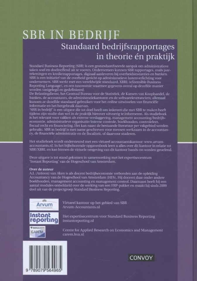 'SBR in bedrijf' is een uitgave die tot doel heeft om iedereen die met SBR te maken heeft tijdens zijn studie dan wel in de praktijk hierover uitvoerig te informeren. Als studieboek is het relevant voor vakken als externe verslaggeving, management accounting/bedrijfseconomie, administratieve organisatie/interne controle, boekhouden, controleleer, fiscaal recht en financiering. Het kan naast de bestaande literatuur per vakgebied worden gebruikt. SBR in bedrijf is met name geschreven voor mensen die werkzaam zijn in de accountancy, de financiële administratie en de fiscaliteit, of daarvoor studeren.