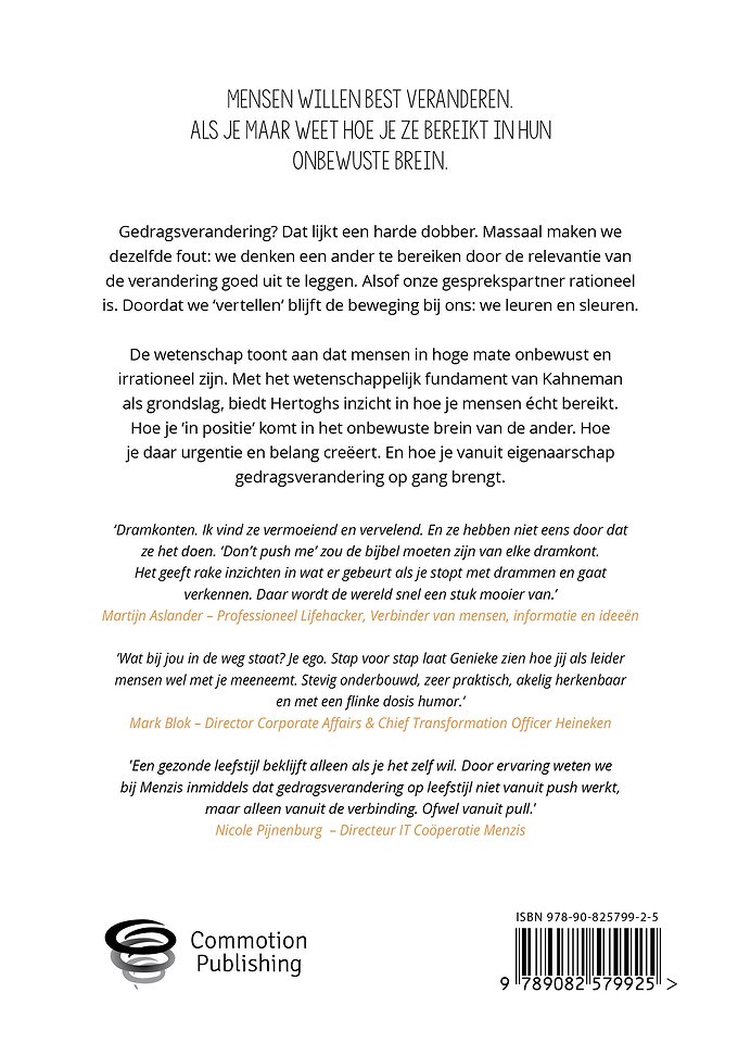 Mensen willen best veranderen. Als je maar weet hoe je ze bereikt in hun onbewuste besliscentrum. Iemand van gedrag laten veranderen? Dat lijkt een harde dobber. We proberen belang en urgentie te creëren. We werken aan intrinsieke motivatie. Aan proactieve mensen die vanuit eigenaarschap ander gedrag gaan vertonen. Waarom lijkt het zo lastig? Massaal maken we dezelfde systematische denkfout in onze communicatie. En daarmee houden we onszelf tegen. We denken dat we een ander kunnen bewegen als we de relevantie van de verandering goed voor het voetlicht brengen. Alsof onze gesprekspartner rationeel is. Doordat we vertellen, motiveren, uitleggen, aantonen en storytellen blijft de urgentie, het belang én de beweging bij ons: we leuren en sleuren. De wetenschap toont aan dat mensen in hoge mate onbewust, irrationeel en emotioneel zijn. Hoe bereik je de ander in z’n onbewuste besliscentrum? Genieke Hertoghs is één van de grondleggers van het gedachtegoed Subconscious Impact. Met het wetenschappelijk fundament van Daniel Kahneman als grondslag, biedt Hertoghs inzicht in hoe je mensen écht bereikt. Hoe je eerst ‘in positie komt’ in het onbewuste brein van de ander. Hoe je daar vervolgens verbinding, eigenaarschap en zelfs gedragsverandering op gang brengt. Als je het eenmaal snapt én je hebt je eigen ego onder controle, dan is daadwerkelijke gedragsverandering eenvoudig. Dit boek geeft bovendien een doorkijkje naar de volle potentie van het gedachtegoed Subconscious Impact op grotere schaal. Hoe kan het polarisatie voorkomen? En hoe breekt het stevig ingekapselde bubbels open? Hoe draagt het bij aan een meer inclusieve samenleving? En tot slot: hoe stimuleren we gedragsverandering in onze samenleving naar een gezonde leefstijl? 'Don’t push me!' vat de essentie van het boek 'Impact: de kracht van onzichtbare invloed' van Van den Berg & Hertoghs uit 2018 samen. En verrijkt dat met een systematische aanpak om een ander écht te bewegen. Het boek is doorspekt met voorbeelden uit 10 jaar lang (praktijk-) onderzoek. Reviews vooruitlezers 'Don’t push me! - Hoe je mensen wél beweegt' Het voelt als heel compleet, kleurrijk, herkenbaar, zeer prettig en leesbaar geschreven boek. Een stuk theoretische, wetenschappelijke basis, gecombineerd met een grote dosis kennis, ervaring en bijna alledaagse praktijksituaties. Wat mij betreft zou dit boek verplichte kost moeten zijn bij mijn gehele beroepsgroep, HBO en universitaire opleidingen HRM, maar ook andere sociale, pedagogische vakken. Verder iedereen die hiërarchisch en/of functioneel leiding geeft. En dat ze zelf ontdekken hoe toepasbaar het concept is in de eigen rol (want toch handig als een bevelvoerder bij een brand gewoon zegt wie, wat moet doen). Zo denken, spreken en handelen is een ‘other-way-of-life’. Het boek zou ook goed zijn voor beleidsmakers, politici en voor leden van Ondernemingsraden. Sowieso interessant in deze polariserende samenleving waar ieder voor zich lijkt te gaan en er weinig naar elkaar geluisterd wordt. - Peter Linssen - Businesspartner P&O gemeente Den Haag Wat een eye opener: ook push kan bijdragen aan succesvolle verandering! Mijn nieuwe uitdaging na het lezen van dit boek? Bagger in goud veranderen. En natuurlijk mijn eigen ego vaker de mond snoeren... Dit boek is relevant voor iedereen. Zonder uitzondering. In het bijzonder voor iedereen die impact wil hebben op welk niveau dan ook. Heel goed leesbaar, lekker praktisch met veel verhelderende voorbeelden. Een fijne opfrisser na het eerste boek Impact - de kracht van onzichtbare invloed. - Mariëlle Bothof - Algemeen Directeur Huisartsen Coöperatie Medicamus U.A. Dramkonten. Ik vind ze vermoeiend en vervelend. En ze hebben niet eens door dat ze het doen. ‘Don’t push me’ zou de bijbel moeten zijn van elke dramkont. Het geeft rake inzichten in wat er gebeurt als je stopt met drammen en gaat verkennen. Daar wordt der wereld snel een stuk mooier van. - Martijn Aslander – professioneel lifehacker, verbinder van mensen, informatie en ideeën Wat bij jou in de weg staat? Je ego. Stap voor stap laat Genieke zien hoe jij als leider mensen wel met je meeneemt. Stevig onderbouwd, zeer praktisch, akelig herkenbaar en met een flinke dosis humor. - Mark Blok – Director Corporate Affairs & Chief Transformation Officer Heineken Een gezonde leefstijl beklijft alleen als je het zelf wil. Door ervaring weten we bij Menzis inmiddels dat gedragsverandering op leefstijl niet vanuit push werkt, maar alleen vanuit de verbinding. Ofwel vanuit pull. - Nicole Pijnenburg – Directeur ICT Coöperatie Menzis Zowel qua schrijfstijl, maar ook qua opmaak is het een vlot boek. Gelardeerd met praktische voorbeelden (uit verschillende omgevingen), waardoor de theorie tot leven komt. Wat fijn is, zijn de samenvattingen op het einde. Dan kom je tot de essentie van het hoofdstuk. Het boek is een krachtig pleidooi om mensen mee te krijgen in een verandering. Goed dat je op een gegeven moment een switch maakt naar het nut van pushen (maar niet teveel ..). Het aloude dilemma van een leidinggevende: wanneer geef ik ruimte en wanneer stuur ik bewust wordt daarmee recht gedaan. Je slaat daarin ook een brug hoe je dat kan doen. - Ruud Bakker - Gemeentesecretaris Gemeente Gouda