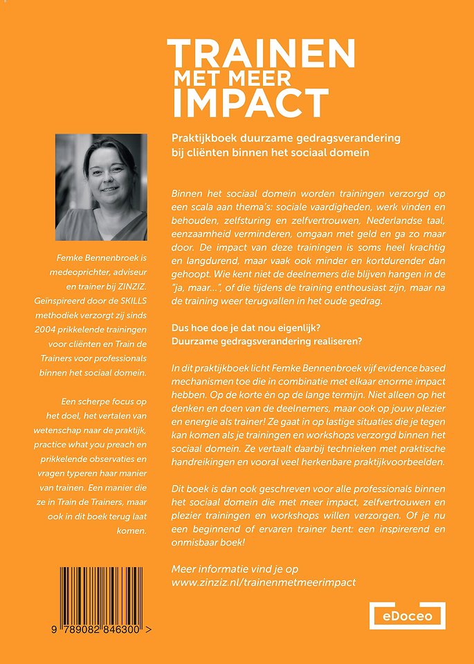 In dit praktijkboek licht Femke Bennenbroek vijf evidence based mechanismen toe die in combinatie met elkaar enorme impact hebben. Op de korte èn op de lange termijn. Niet alleen op het denken en doen van de deelnemers, maar ook op jouw plezier en energie als trainer! Ze gaat in op lastige situaties die je tegen kan komen als je trainingen en workshops verzorgd binnen het sociaal domein. Ze vertaalt daarbij technieken met praktische handreikingen en vooral veel herkenbare praktijkvoorbeelden.