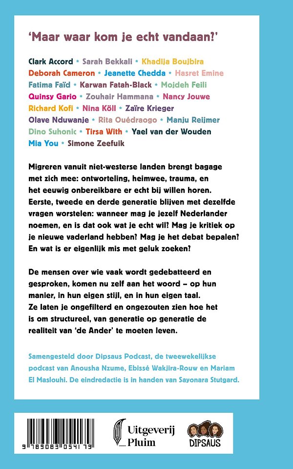Met bijdragen van kunstenaar en anti-racisme activist Quinsy Gario, scenarioschrijver Manju Reijmer, media- en cultuurwetenschapper Nina Köll, schrijver en visagist Clark Accord, case-worker voor mensenrechten Sarah Bekkali, schrijver en activist Mojdeh Feili, schrijver en antivalidisme-activist Jeanette Chedda, kunstenaar, curator en podcaster Richard Kofi, moeder, echtgenote, vechter en overlever Khadija Boujbira, schrijver en cultureel programmamaker Simone Zeefuik, jurist, activist en politica Olave Nduwanje, spoken-word artiest en activist Tirsa With, queer activist Dino Suhonic, dichter, recensent en onderzoeker Mia You, schrijver, fotograaf en historicus Hasret Emine, journalist en spoken word artiest Zaïre Krieger, blogger en social cultureel ondernemer Deborah Cameron, historicus Karwan Fatah-Black, schrijver en uitgever Yael van der Wouden, onderzoeker en curator Rita Ouédraogo, socioloog Zouhair Hammana, cultuurhistoricus Nancy Jouwe en raadslid Fatima Faïd.