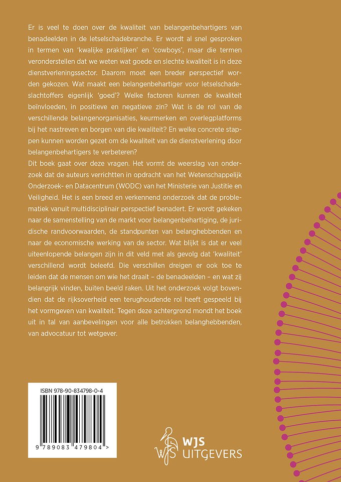 Wat blijkt is dat er veel uiteenlopende belangen zijn in dit veld met als gevolg dat ‘kwaliteit’ verschillend wordt beleefd. Die verschillen dreigen er ook toe te leiden dat de mensen om wie het draait – de benadeelden – en wat zij belangrijk vinden, buiten beeld raken. Uit het onderzoek volgt bovendien dat de rijksoverheid een terughoudende rol heeft gespeeld bij het vormgeven van kwaliteit. Tegen deze achtergrond mondt het boek uit in tal van aanbevelingen voor alle betrokken belanghebbenden, van advocatuur tot wetgever.