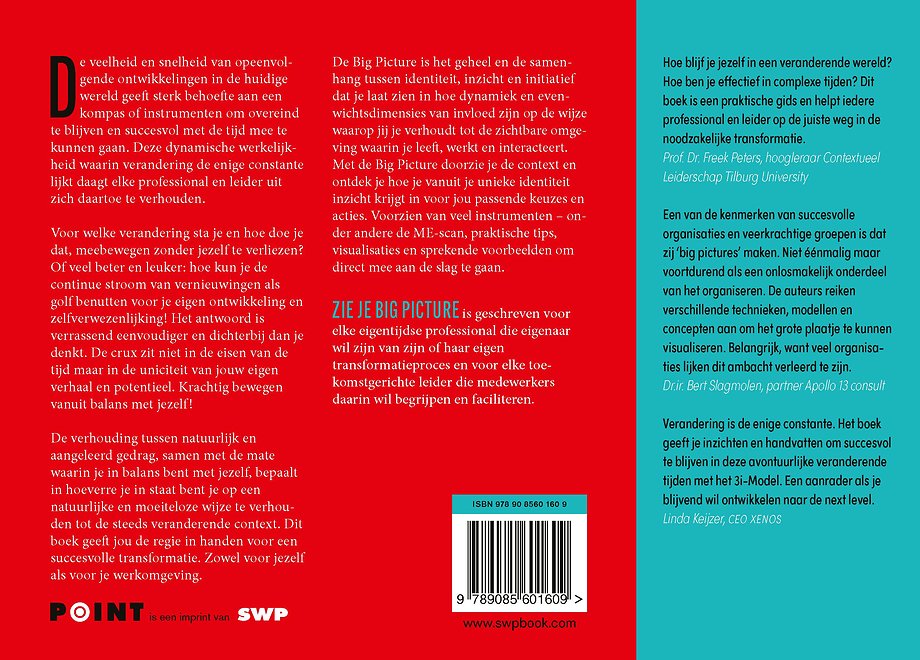 De BIG PICTURE is het geheel en de samenhang tussen identiteit, inzicht en initiatief dat je laat zien in hoe dynamiek en evenwichtsdimensies van invloed zijn op de wijze waarop jij je verhoudt tot de zichtbare omgeving waarin je leeft, werkt en interacteert. Met de BIG PICTURE doorzie je de context en ontdek je hoe je vanuit je unieke identiteit inzicht krijgt in voor jou passende keuzes en acties. Voorzien van veel instrumenten, praktische tips, visualisaties en sprekende voorbeelden om direct mee aan de slag te gaan.