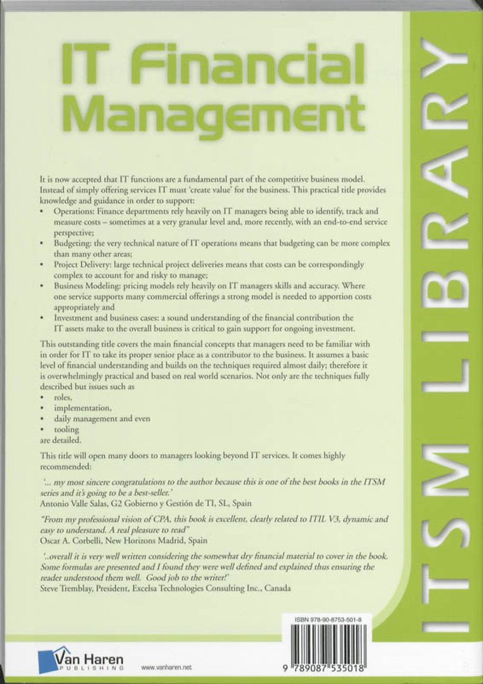 Deze uitgave beschrijft de belangrijkste financiële concepten waar IT managers vertrouwd mee moeten zijn willen zij binnen een bedrijf werkelijk wat toevoegen. Het boek veronderstelt een basisniveau van financieel kennis en bouwt voort op de dagelijks vereiste technieken.