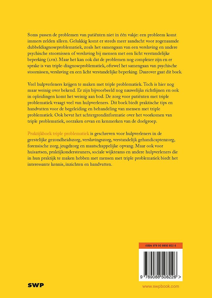 Soms passen de problemen van patiënten niet in één vakje: een probleem komt immers zelden alleen. Gelukkig komt er steeds meer aandacht voor zogenaamde dubbeldiagnoseproblematiek, zoals het samengaan van een verslaving en andere psychische stoornissen of verslaving bij mensen met een licht verstandelijke beperking (LVB). Maar het kan ook dat de problemen nog complexer zijn en er sprake is van triple-diagnoseproblematiek, oftewel het samengaan van psychische stoornissen, verslaving en een licht verstandelijke beperking. Daarover gaat dit boek.