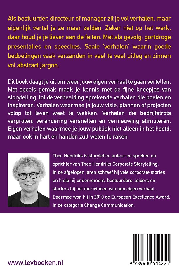 Dit boek daagt u uit om weer uw eigen verhaal te gaan vertellen. Met speels gemak maakt u kennis met de fijne kneepjes van storytelling: verhalen van vlees en bloed die boeien en inspireren. Verhalen waarmee u visie, missie, strategieën, plannen, businesscases en projecten volop tot leven weet te wekken.