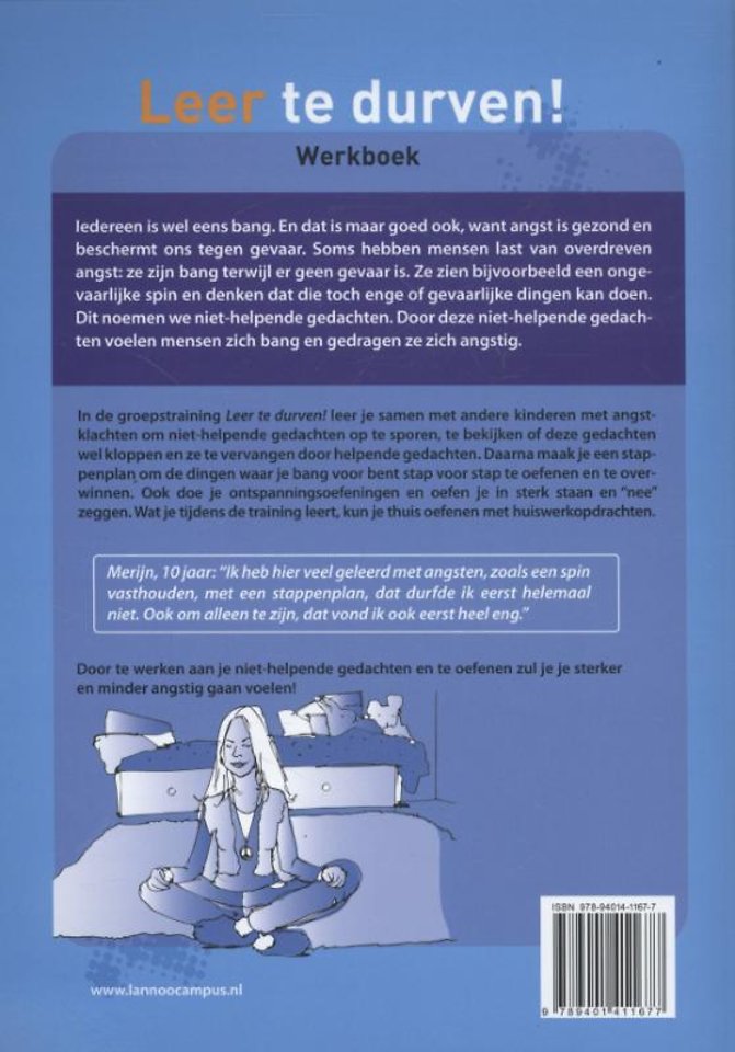 Voorkom ernstige angst bij kinderen Iedereen is wel eens bang. En dat is maar goed ook, want angst is gezond en beschermt ons tegen gevaar. Soms hebben mensen last van overdreven angst: ze zijn bang terwijl er geen gevaar is. Ze zien bijvoorbeeld een ongevaarlijke spin en denken dat die toch enge of gevaarlijke dingen kan doen. Dit noemen we niet-helpende gedachten. Door niet-helpende gedachten voelen mensen zich bang en gedragen ze zich angstig. In de groepstraining Leer te durven! Leer je samen met andere kinderen de angstklachten om niet-helpende gedachten op te sporen, te bekijken of deze gedachten wel kloppen en ze te vervangen door helpende gedachten. Daarna maak je een stappenplan om de diengen waar je bang voor bent stap voor stap te oefenen en te overwinnen. Ook doe je ontspanningsoefeningen en oefen je in sterk staan en 'nee' zeggen. Wat je tijdens de training leert, kun je thuis oefenen door huiswerkopdrachten. Merlijn, 10 jaar: 'Ik heb hier veel geleerd met angsten, zoals een spin vasthouden, met een stappenplan, dat durfde ik eerst helemaal niet. Ook om alleen te zijn, dat vond ik ook eerst heel eng.' Door te werken aan je niet-helpende gedachten en te oefenen zal je je sterker en minder angstig gaan voelen!