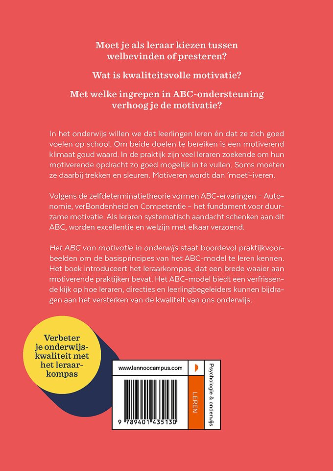 'Het ABC van motivatie in onderwijs' staat boordevol praktijkvoorbeelden om de basisprincipes van het ABC-model te leren kennen. Het boek introduceert het leraarkompas, dat een brede waaier aan motiverende praktijken bevat. Het ABC-model biedt een verfrissende kijk op hoe leraren, directies en leerlingbegeleiders kunnen bijdragen aan het versterken van de kwaliteit van ons onderwijs.