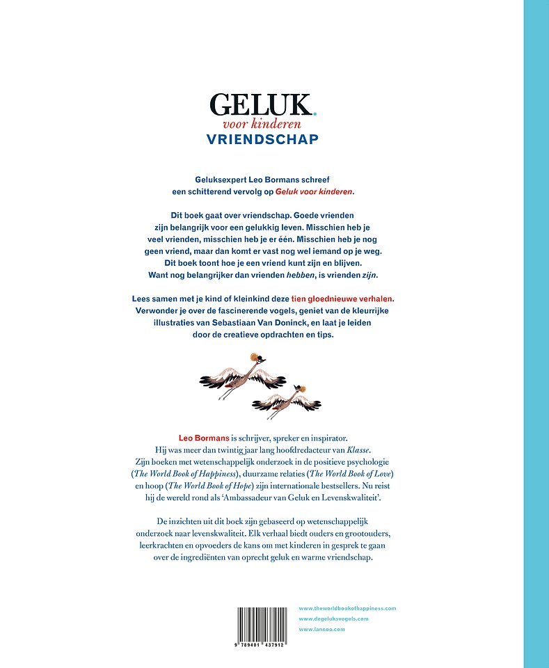Geluksexpert Leo Bormans schreef een schitterend vervolg op Geluk voor kinderen.Dit boek gaat over vriendschap. Goede vrienden zijn belangrijk voor een gelukkig leven. Misschien heb je veel vrienden, misschien heb je er één. Misschien heb je nog geen vriend, maar dan komt er vast nog wel iemand op je weg. Dit boek toont hoe je een vriend kunt zijn en blijven. Want nog belangrijker dan vrienden hebben, is vrienden zijn.