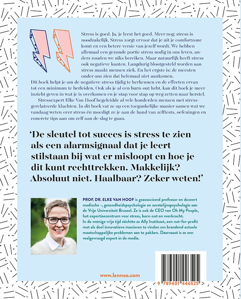 Stressexpert Elke Van Hoof begeleidde al vele honderden mensen met stressgerelateerde klachten. In dit boek vat ze op een toegankelijke manier samen wat we vandaag weten over stress én moedigt ze je aan de hand van zelftests, oefeningen en concrete tips aan om zelf aan de slag te gaan. 'De sleutel tot succes is stress te zien als een alarmsignaal dat je leert stilstaan bij wat er misloopt en hoe je dit kunt rechttrekken. Makkelijk? Absoluut niet. Haalbaar? Zeker weten!'