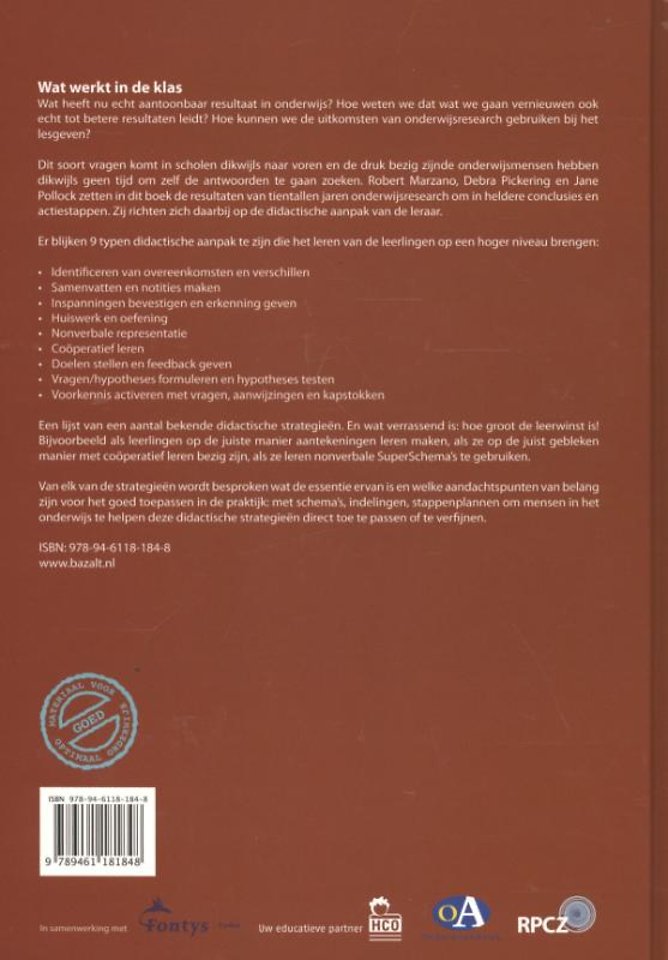 Voor ieder in het onderwijs die echt wil weten welke didactische aanpak de resultaten van de leerlingen aantoonbaar verbetert, biedt dit boek zicht op research uitkomsten, overzichten en beschrijvingen van wat werkt. De auteurs zetten tientallen jaren wetenschappelijke informatie om in heldere actieplannen voor de praktijk. Er blijken 9 soorten didactische aanpak te zijn die het leren van de leerling op hoger niveau brengen.