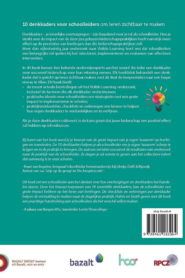In dit boek komen tien bekende onderwijsexperts aan het woord die ieder een denkkader voor succesvol leiderschap voor hun rekening nemen. Elk hoofdstuk behandelt een denkkader dat is gericht op leren zichtbaar maken, met als doel de leerprestaties naar een hoger niveau te tillen.