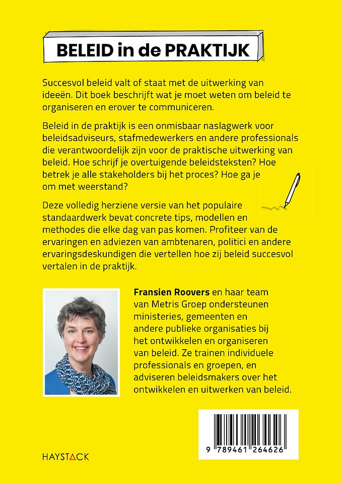 Fransien Roovers en haar team van Metris Groep ondersteunen ministeries, gemeenten en andere publieke organisaties bij het ontwikkelen en organiseren van beleid. Ze trainen individuele professionals en groepen, en adviseren beleidsmakers over het ontwikkelen en uitwerken van beleid. Ze is de auteur van Beleid in de praktijk.