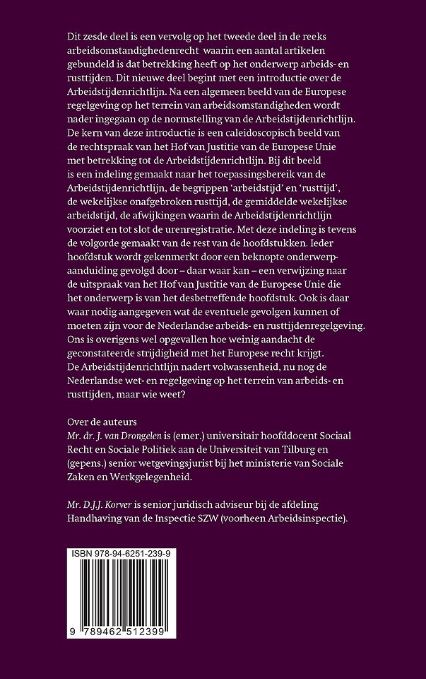 Dit zesde deel is een vervolg op het tweede deel in de reeks arbeidsomstandighedenrecht waarin een aantal artikelen gebundeld is dat betrekking heeft op het onderwerp arbeids- en rusttijden. Dit nieuwe deel begint met een introductie over de Arbeidstijdenrichtlijn. Na een algemeen beeld van de Europese regelgeving op het terrein van arbeidsomstandigheden wordt nader ingegaan op de normstelling van de Arbeidstijdenrichtlijn.