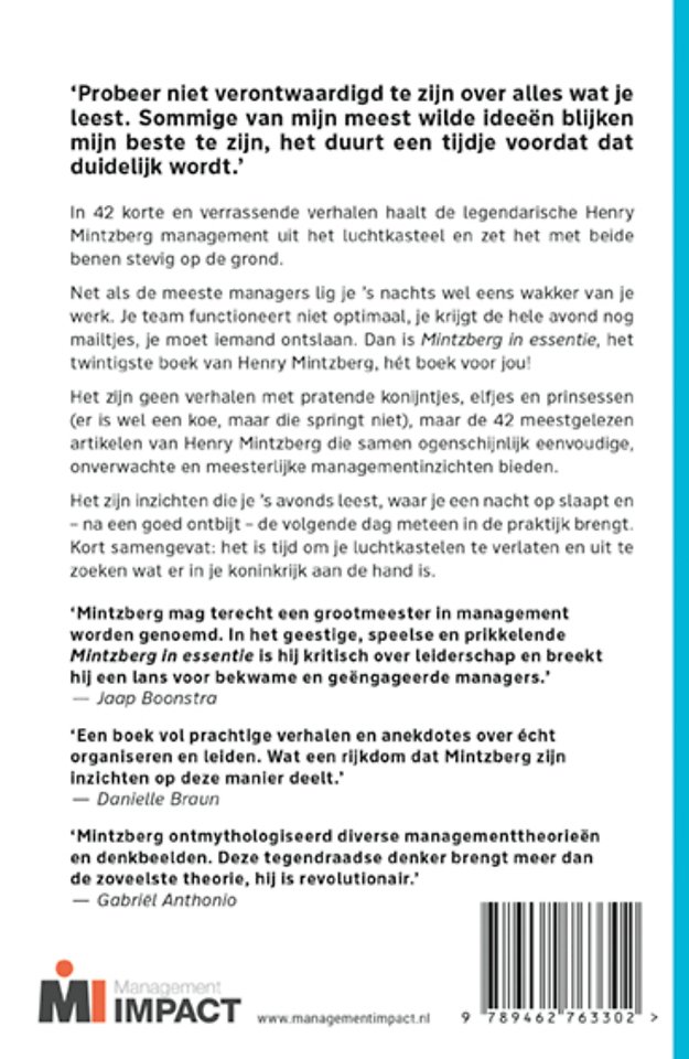 Je ligt waarschijnlijk net als de meeste managers ’s nachts wakker van je werk. Je team functioneert niet optimaal, je krijgt de hele avond nog mailtjes, je moet iemand ontslaan. Dan is Mintzberg in essentie, het twintigste boek van Henry Mintzberg, hét boek voor jou! Het zijn geen verhalen met pratende konijntjes, elfjes en prinsessen (er is wel een koe, maar die springt niet), maar de 42 meest gelezen artikelen van Henry Mintzberg die samen ogenschijnlijk eenvoudige, onverwachte en meesterlijke managementinzichten bieden.