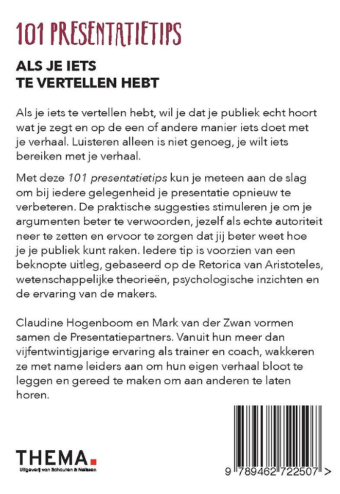 Presenteren is een uitvoerende kunst. Om die onder de knie te krijgen, is veel doen een noodzakelijke voorwaarde. Met deze 101 Presentatietips kun je bij iedere gelegenheid je presentatie opnieuw verbeteren. De praktische suggesties stimuleren je om je argumenten beter te verwoorden, jezelf als echte autoriteit neer te zetten en ervoor te zorgen dat jij beter weet hoe je je publiek kunt raken. Zoals Aristoteles zou zeggen: ‘je verbetert de logos, ethos en pathos van je betoog.’ Je kunt meteen aan de slag en ervaart direct effect in de praktijk. Iedere tip is voorzien van een beknopte uitleg, gebaseerd op de Retorica van Aristoteles, wetenschappelijke theorieën, psychologische inzichten en de ervaring van de makers.