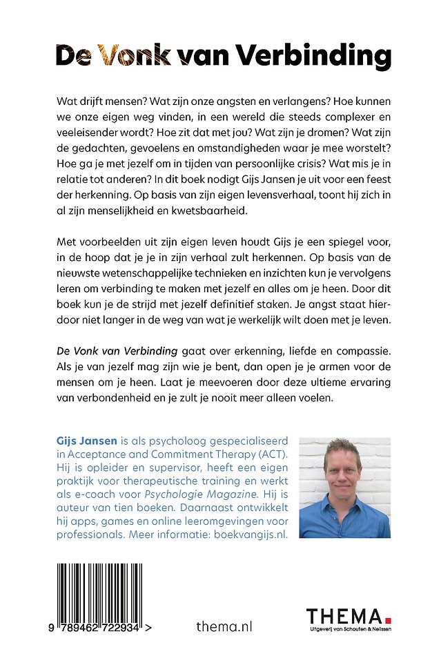 Met voorbeelden uit zijn eigen leven houdt Gijs je een spiegel voor, in de hoop dat je je in zijn verhaal herkent. Op basis van de nieuwste wetenschappelijke technieken en inzichten kun je vervolgens leren om verbinding te maken met jezelf en alles om je heen. Door dit boek kun je de strijd met jezelf definitief staken. Je angst staat hierdoor niet langer in de weg van wat je werkelijk wilt doen met je leven.