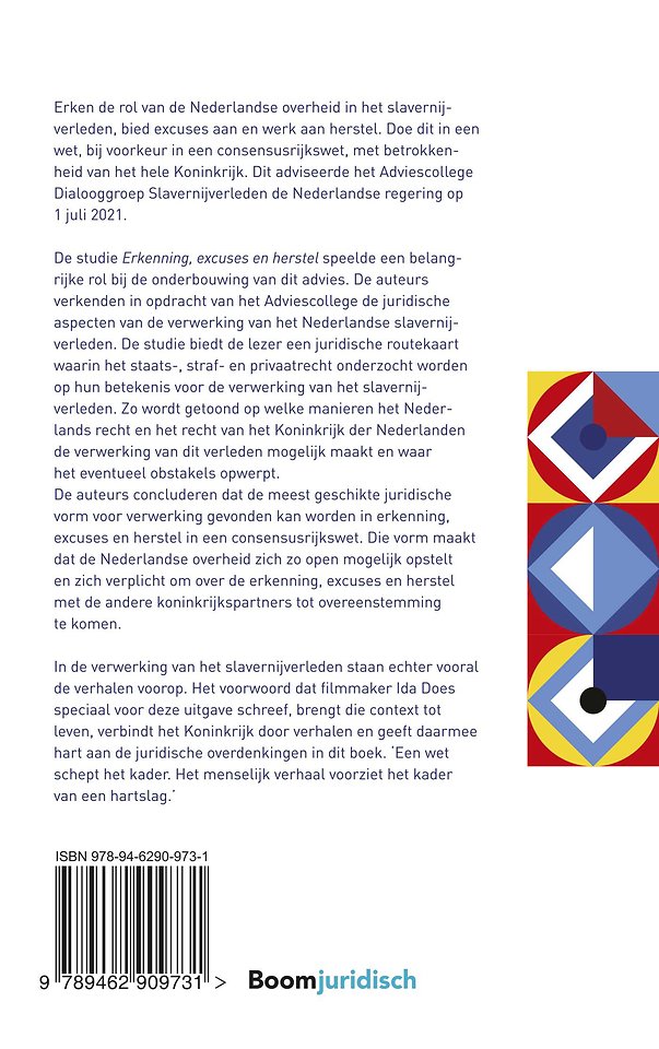 De studie Erkenning, excuses en herstel speelde een belangrijke rol bij de onderbouwing van dit advies. De auteurs verkenden in opdracht van het Adviescollege de juridische aspecten van de verwerking van het Nederlandse slavernijverleden. De studie biedt de lezer een juridische routekaart waarin het staats, straf en privaatrecht onderzocht worden op hun betekenis voor de verwerking van het slavernijverleden. Zo wordt getoond op welke manieren het Nederlands recht en het recht van het Koninkrijk der Nederlanden de verwerking van dit verleden mogelijk maakt en waar het eventueel obstakels opwerpt.