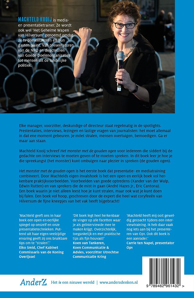 Machteld Kooij schreef 'Het monster met de gouden ogen' voor iedereen die siddert bij de gedachte om interviews te moeten geven of te moeten spreken. In dit boek leer je hoe je die spreekangst (het monster) kunt ombuigen naar plezier in spreken (de gouden ogen).