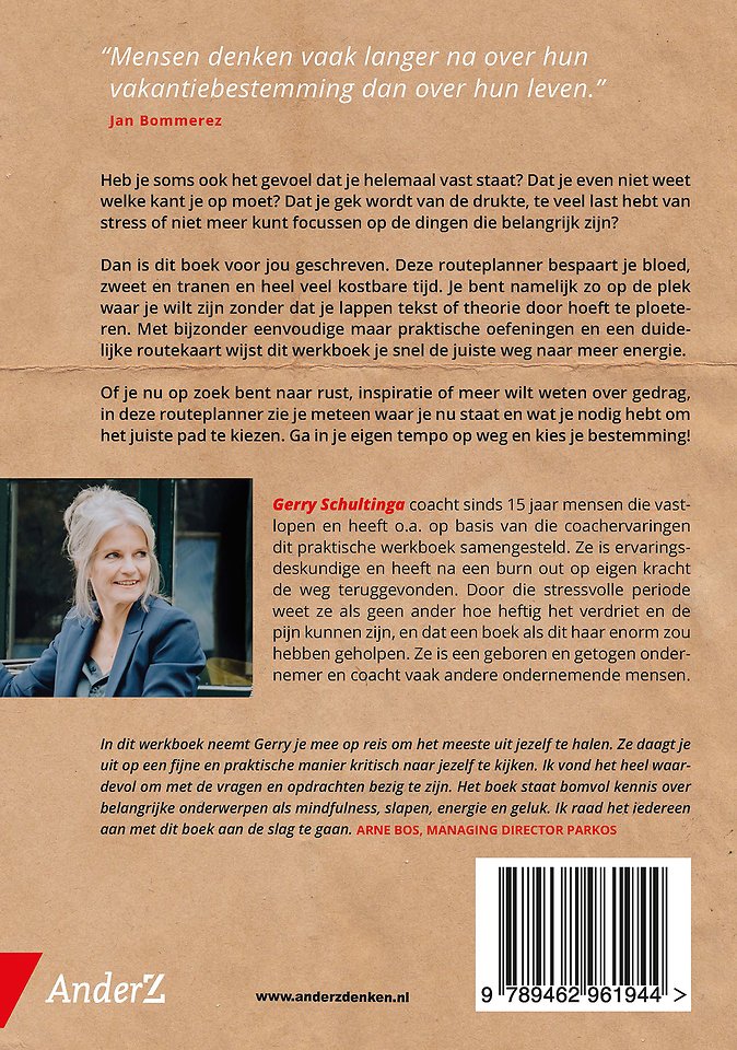Gerry Schultinga coacht al 16 jaar ondernemers die teveel hooi op hun vork nemen en daardoor vastlopen. Tijdens deze coaching maakt ze gebruik van praktische tools. Steeds vaker hoorde ze: “Je moet een boek schrijven dan zetten veel meer mensen waardevolle stappen!” Ze schreef een aantrekkelijk werkboek. Deze 'routeplanner' brengt je in no time weer op weg als je niet weet welke kant je op moet.