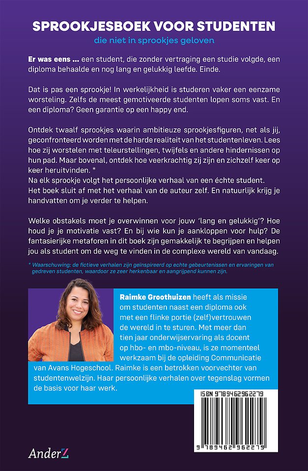 Na ieder sprookje volgt het persoonlijke verhaal van een échte student. Welke obstakels moet je tijdens je opleiding overwinnen om nog ‘lang en gelukkig’ te leven? Hoe behoud je je motivatie? Wie kun je om hulp vragen? De laagdrempelige fantasierijke metaforen in het boek bieden een tegenwicht voor de complexe hedendaagse wereld waarin je als student makkelijk de weg kwijt kunt raken.