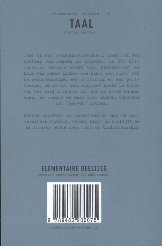 Taal is een communicatiemiddel, maar ook een systeem van regels en woorden. In dit Elementaire Deeltje wordt taal bekeken met de blik van onder andere een kind, een dier, een hersendeskundige, een socioloog en een politieman, om zo tot een compleet beeld te komen van wat taal allemaal is, wat we ermee kunnen doen, en waarom we maar niet kunnen ophouden met (erover) praten.