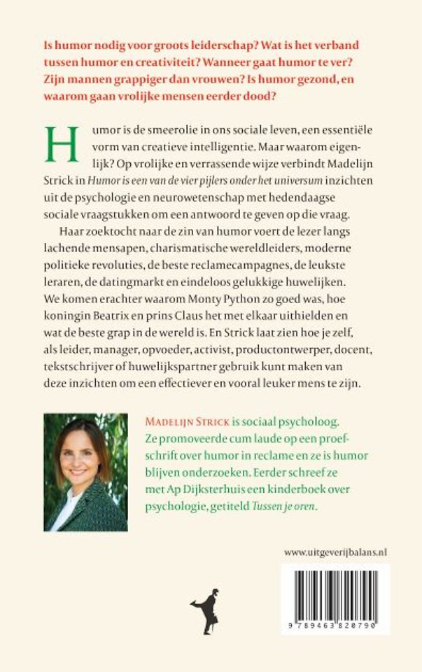 Humor is de smeerolie in ons sociaal functioneren, een essentiële vorm van creatieve intelligentie. Maar waarom eigenlijk? Op ongedwongen en verrassende wijze verbindt Madelijn Strick in Humor is een van de vier pijlers onder het universum inzichten uit de fundamentele psychologie en neurowetenschap met hedendaagse sociale vraagstukken om een antwoord te geven op die vraag.