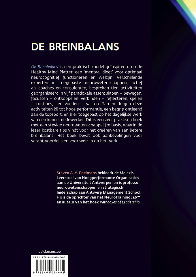 Samen dragen deze activiteiten bij tot hoge performantie, een begrip ontleend aan de topsport, en hier toegepast op het dagelijkse werk van een kennismedewerker. Dit is een zeer praktisch boek met een stevige neurowetenschappelijke basis, waarin de lezer kostbare tips vindt voor het creëren van een betere breinbalans. Het boek bevat ook aanbevelingen voor verantwoordelijken voor welzijn op het werk, met de case van SD Worx waar de breinbalans werd toegepast op organisatieniveau.